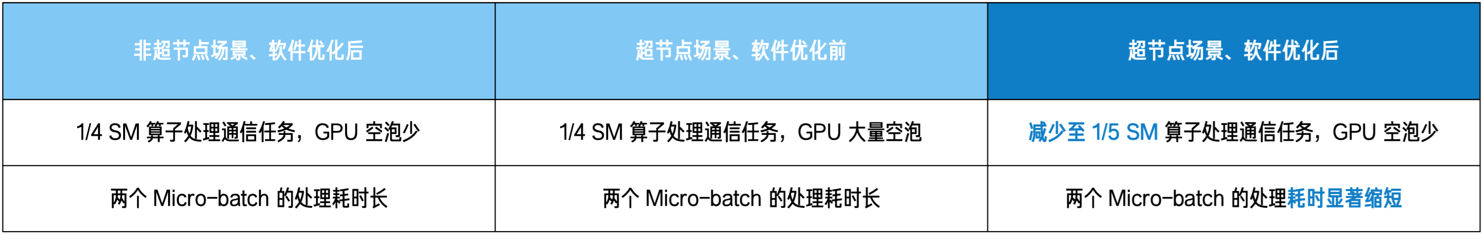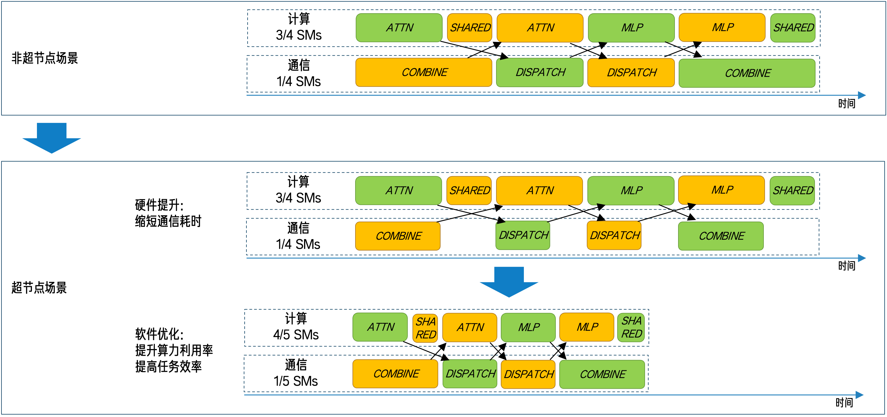 以 MoE 模型的 Prefill 阶段为例:AI 芯片间需要进行高频次的 AlltoAll 通信(如 Dispatch 和 Combine )。在非超节点场景中,受限于网络带宽和延迟,通信占用了较多的 SM(Streaming Multiprocessor)算子资源;而超节点凭借极致互联,大幅缩短通信时长。调度层面因此能将更多的 SM 算子资源释放给计算任务,实现计算与通信的高效重叠(Overlap),显著提升整体效率。