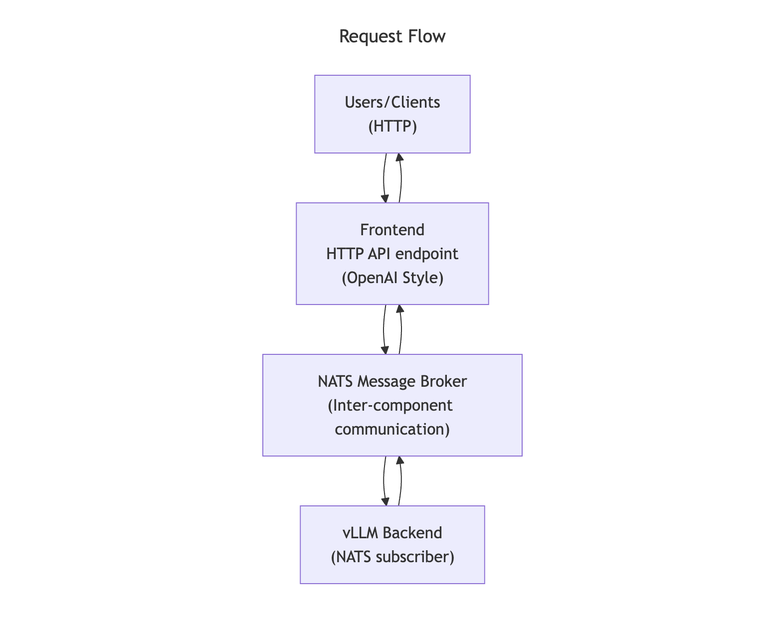 响应流式传输:vLLM backend 执行请求,并通过 NATS 将响应以流的形式返回,frontend 再将其转换回标准的 HTTP 响应。