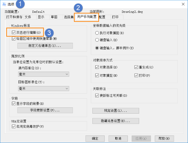 点击菜单【工具-选项】(【OPTIONS】命令),进入选项对话框,在【用户系统配置】页面,勾选【双击进行编辑】,确定保存设置即可。