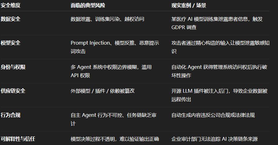 然而,能力越强,风险越大。AI 系统的安全不再局限于“数据隐私”或“模型攻击防御”,而是扩展到系统信任、访问控制、任务自治、行为合规、供应链安全等更复杂的层面。