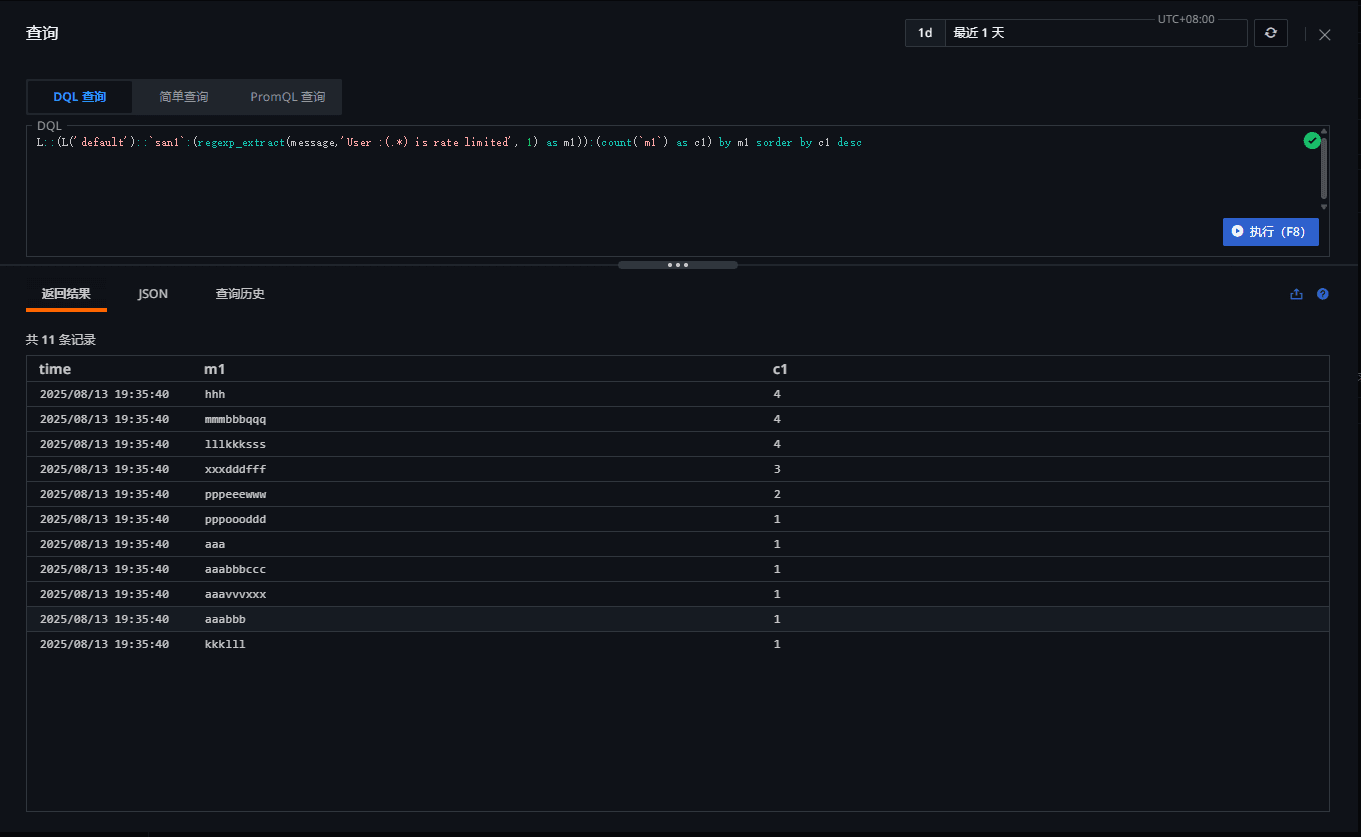 查询返回的结果如下(m1 列就是日志原文中提取出来的 uesrid):