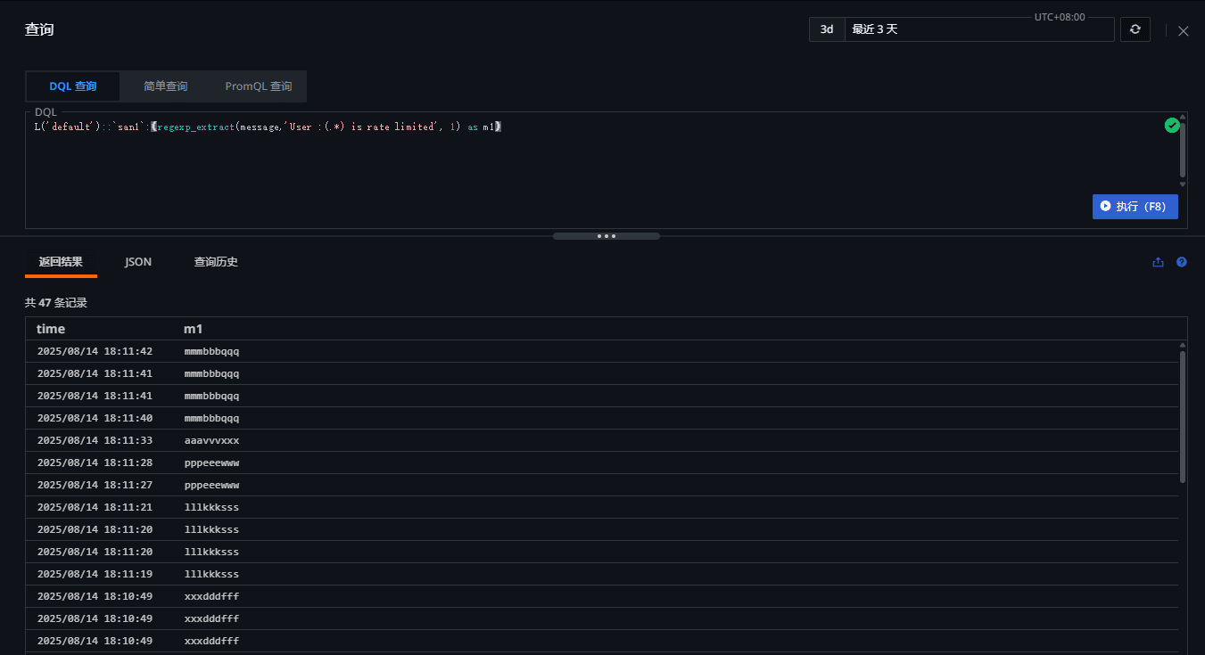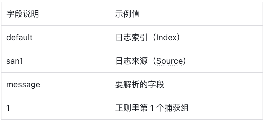 # explain L('日志索引')::`日志来源`:(regexp_extract(message,'正则表达式', 1) as m1) # DQLL('default')::`san1`:(regexp_extract(message,'User :(.*) is rate limited', 1) as m1)