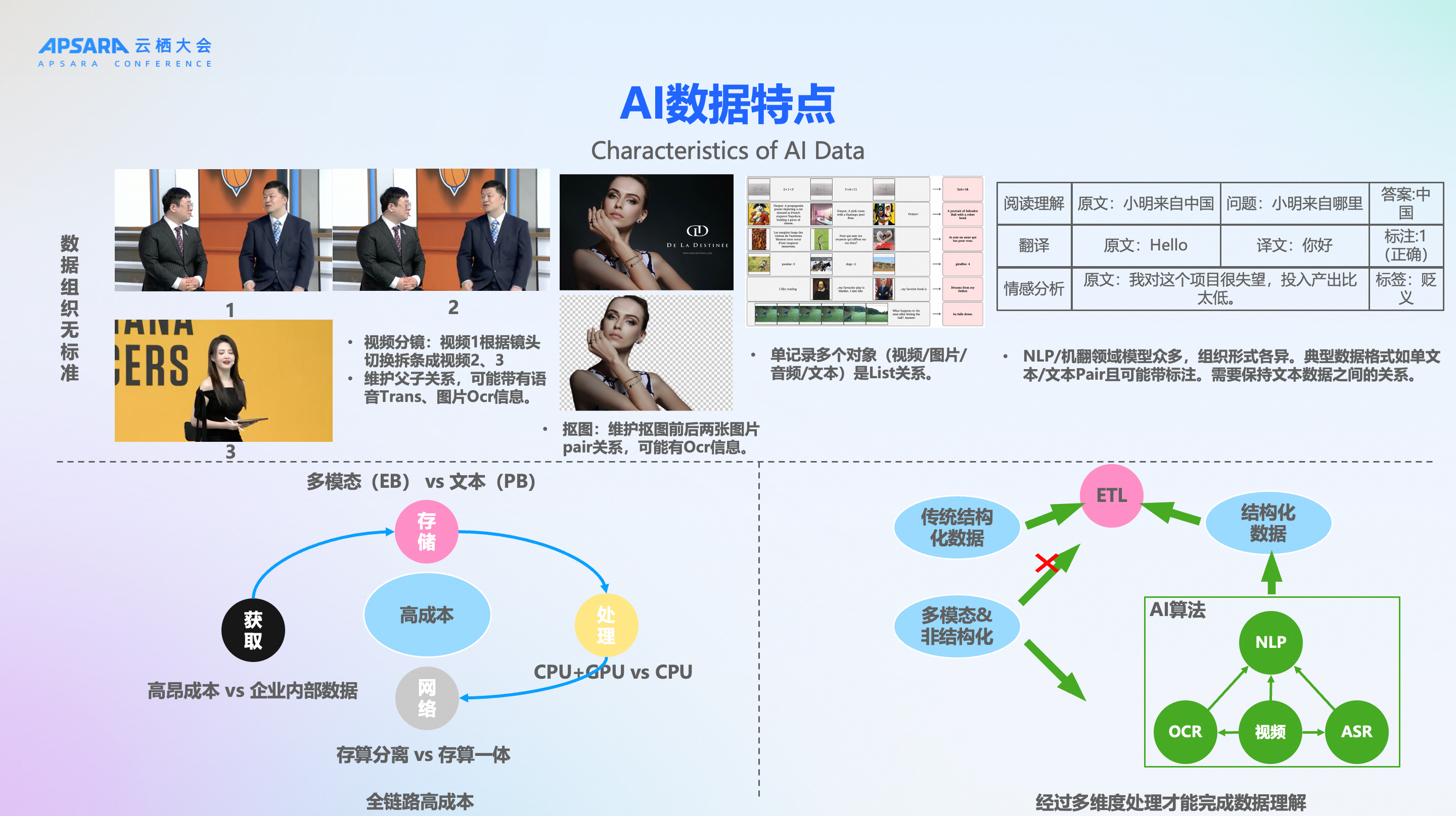 第三个特点就是理解成本也比较高。传统数据简单进行 ETL 就能够完全理解。但是在 AI 数据这方面,理解就比较复杂。以视频为例,至少包含视觉、音频、文本三方面的信息。