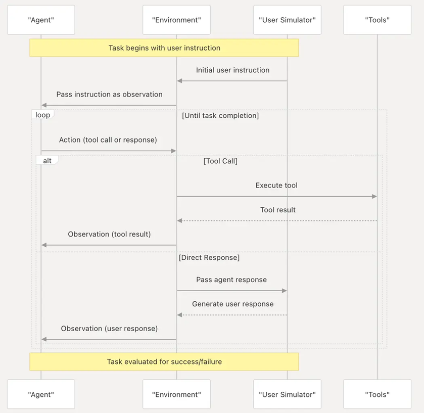 TAU-bench 是一个评估 AI 智能体在真实世界环境中可靠性的基准测试。它评估智能体是否能够在动态的多轮对话中与用户进行交互,理解需求并完成任务。T-bench 测试流程包括: