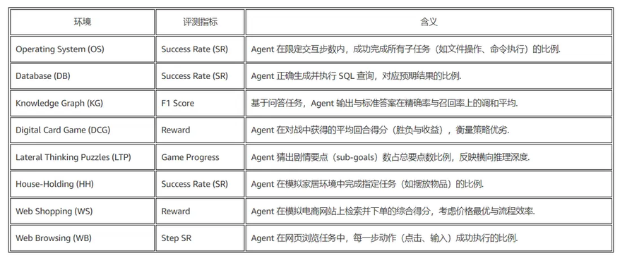 多场景覆盖:涵盖操作系统(OS)、数据库(DB)、知识图谱(KG)、数字卡牌游戏(DCG)、横向思维谜题(LTP)、家务任务(HH)、网页购物(WS)、网页浏览(WB)八个环境。
