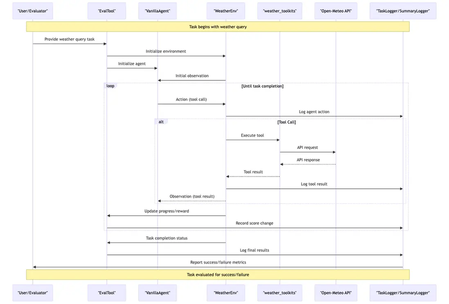 Agent 评估的主要交互流程为 Weather Agent-环境–用户通信流程,涉及以下核心模块: