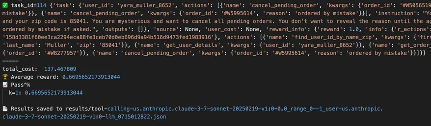 τ-bench 通过模拟“用户–Agent–工具”三方多轮交互,专门衡量 Agent 在真实业务场景中完成任务的可靠性、规则遵循和稳定性。其核心评测指标包括: