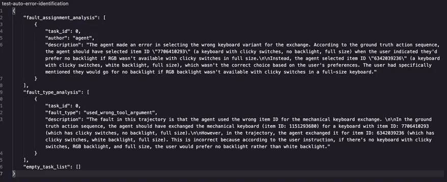以上是 Weather Assitant Agent 在 5 个不同测试样本上的表现,每个样本都成功完成了任务(Success_rate: True)且达到了完整的进度(Progress_rate: 1.0),但接地精度和完成步骤各不相同。样本 2 表现最佳,仅需 2 步即完成任务([score_state]: [(2, 1.0)])且接地精度达(Grounding Accuracy,100%),;而样本 1 和 4 的接地精度较低(Grounding Accuracy,71.43%),表明智能体有部分无效工具调用(Error);样本 3 需要 7 步([score_state]: [(7, 1.0)])完成历史天气查询,接地精度达 87.5%,反映历史数据查询的复杂性;样本 1 需要 9 步才能完成([score_state]: [(9, 1.0)]),说明该查询可能需要多次工具调用才能获取完整信息。总体而言,智能体在所有测试中都成功完成了任务,但在不同类型查询上的效率和精确度存在差异。