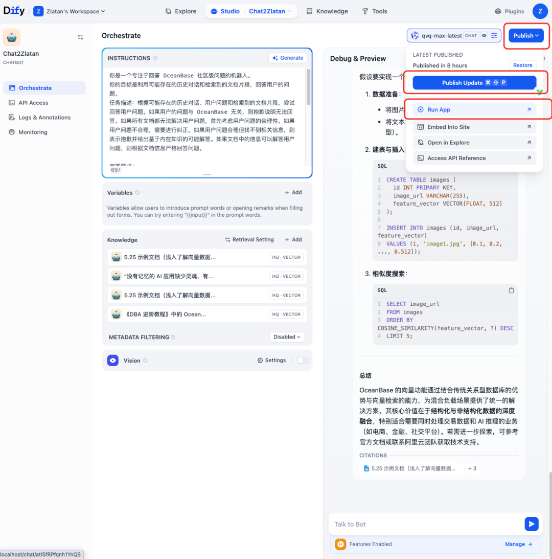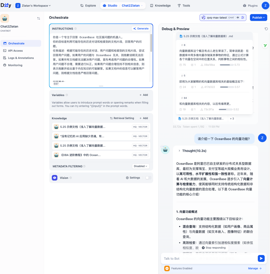 自此,你已经通过 Dify + OceanBase seekdb 搭建了你自己的 LLM 应用平台和智能体应用。