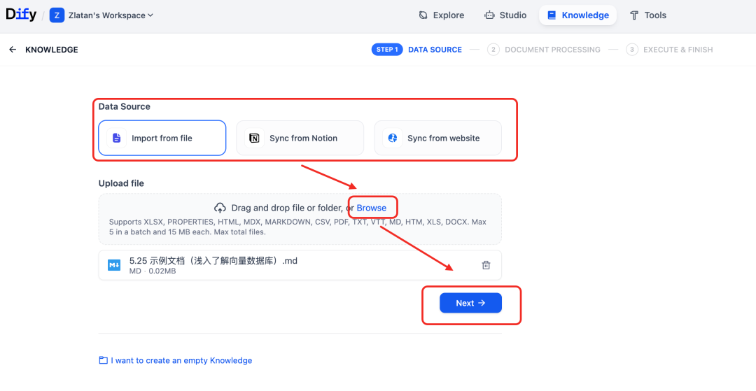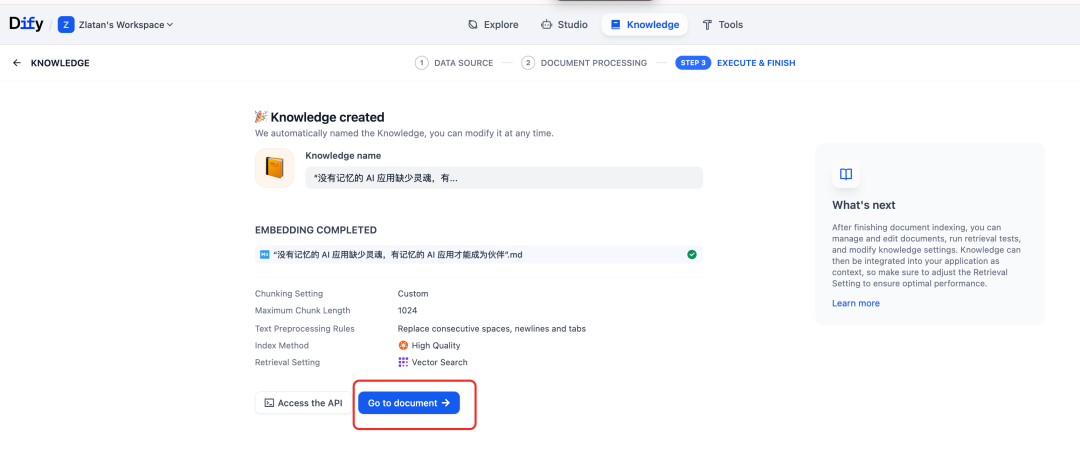 知识库创建完成后,点击 “前往文档”,可以看到该知识库中的文档列表。