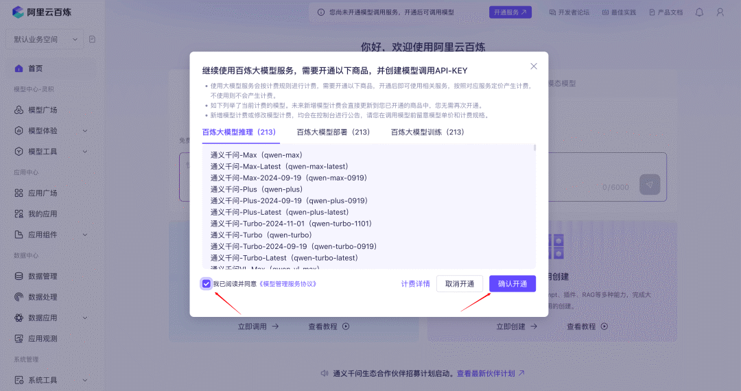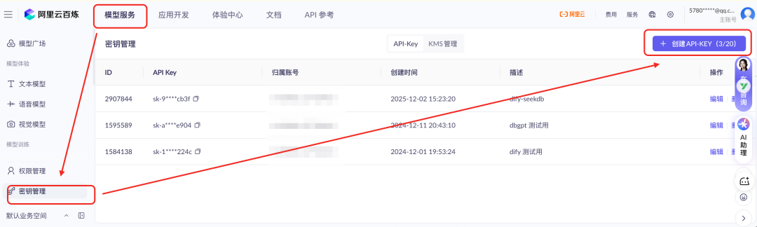 首先,我们需要注册阿里云百炼[2]账号,开通模型调用服务并获取 API Key。