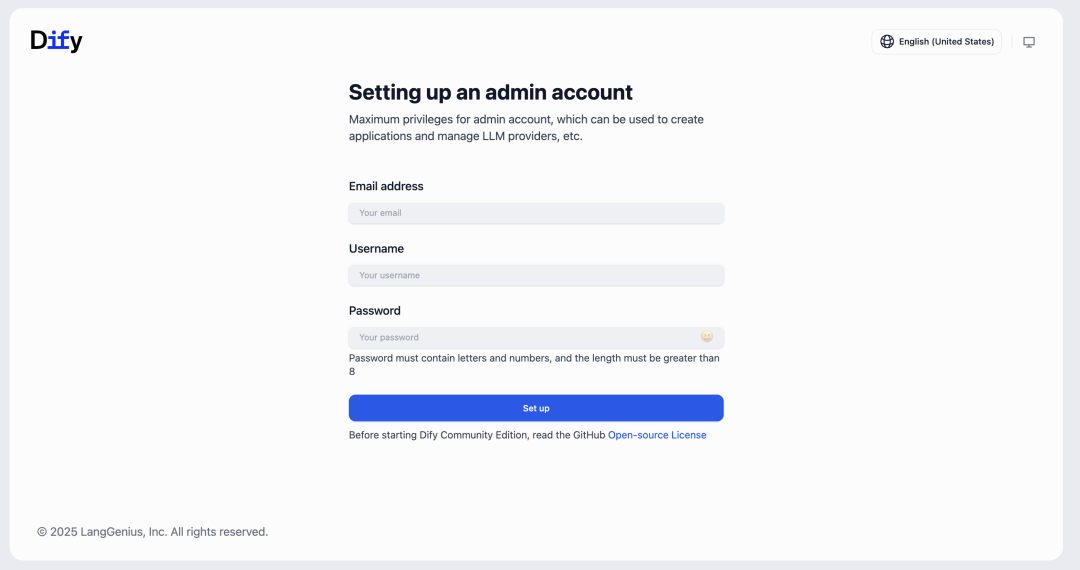 另外两个容器中可能会有Database migration skipped,表示在该容器中跳过了数据库结构迁移,如果没有其他ERROR信息,则说明可以正常打开 Dify 界面了。