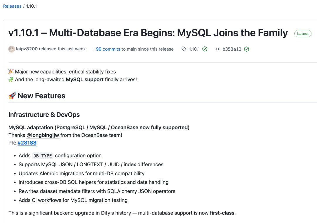 Dify 已适配 MySQL 型 MetaDB,引入 DB_TYPE,一套迁移脚本兼容 PostgreSQL / MySQL / OceanBase,OceanBase / seekdb 可以直接当 Dify 元数据库用。
