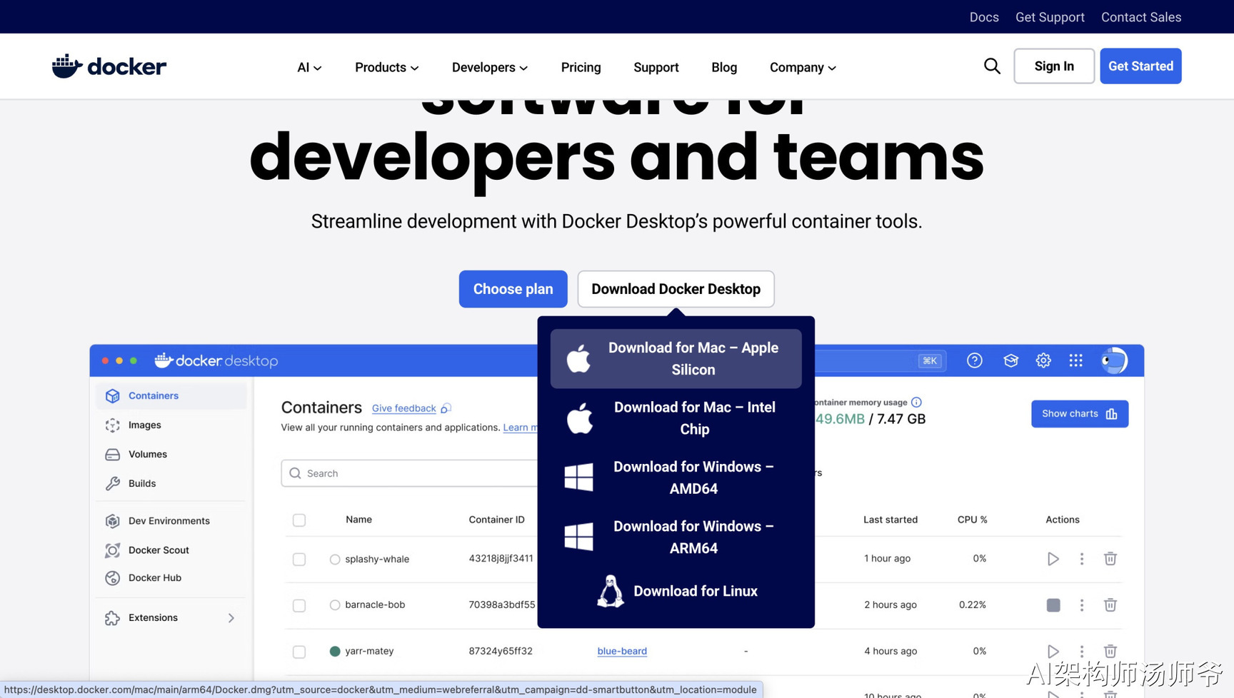 1、到 Docker 官网(https://www.docker.com/products/docker-desktop/)下载安装包