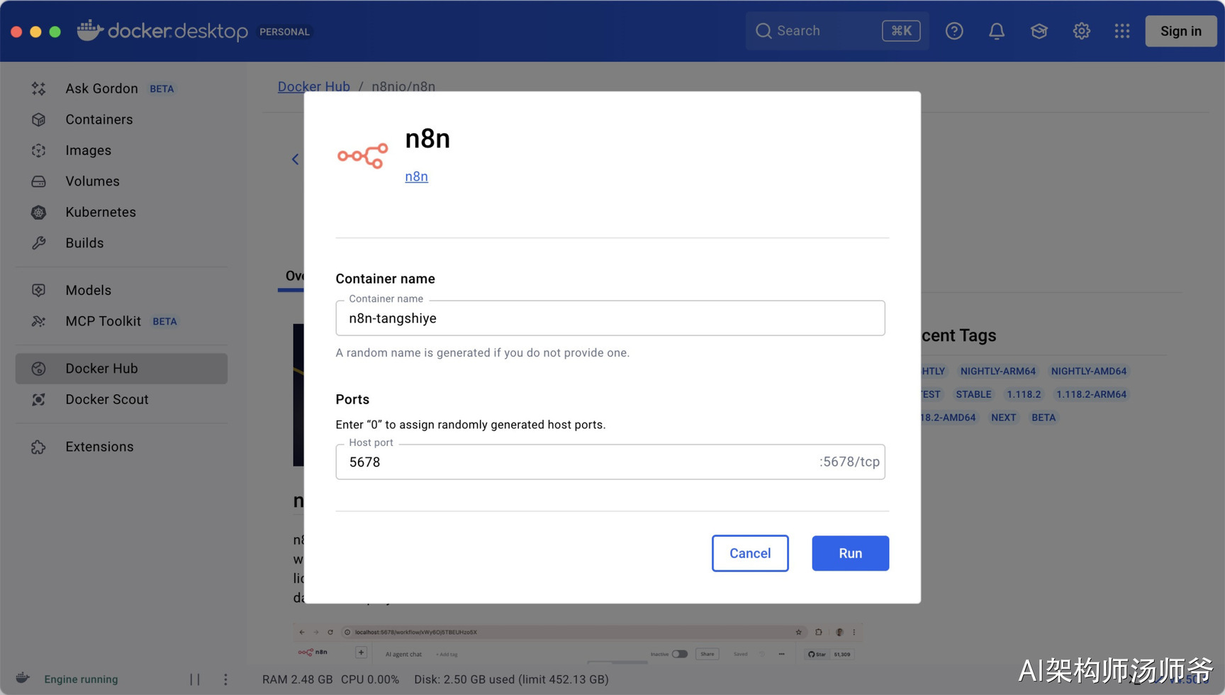 Container name:给容器起个名字,这里我设置 n8n-tangshiye