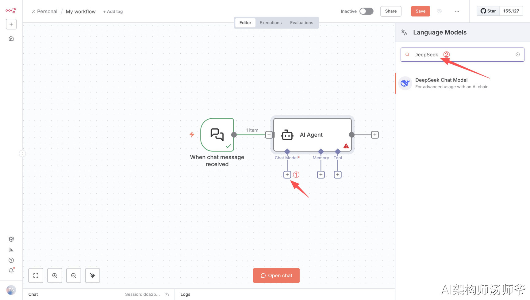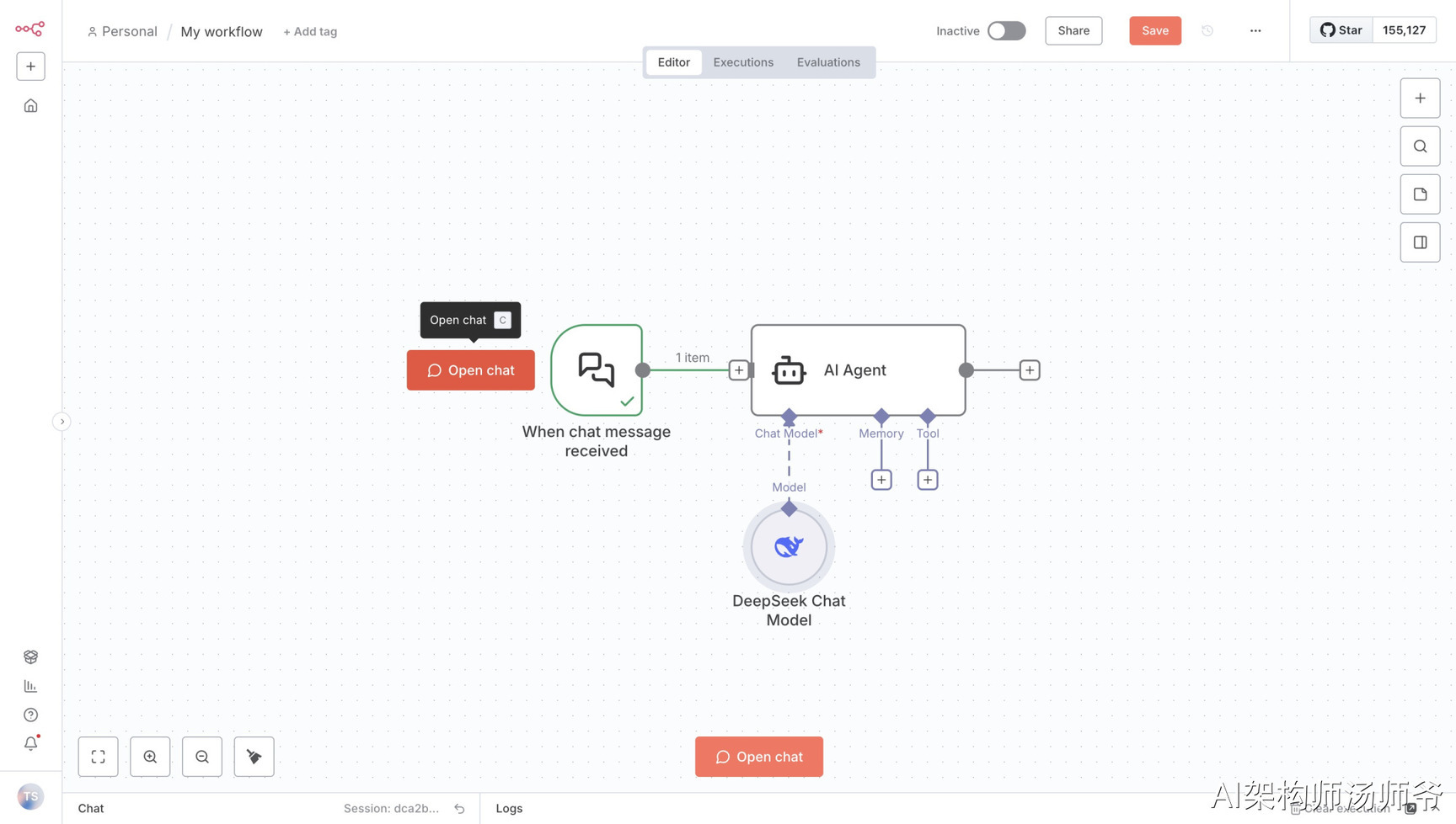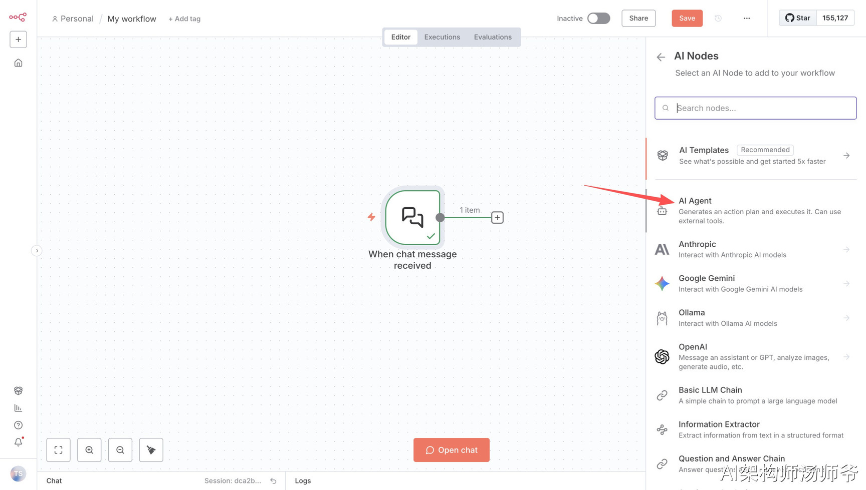 鼠标移动到“When chat messagereceived”节点,点击“open chat”。