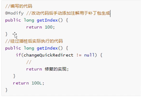 对每个函数都在编译打包阶段自动的插入了一段代码,类似于代理,将方法执行的代码重定向到其他方法中。