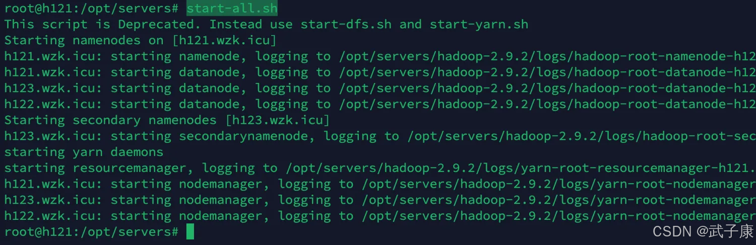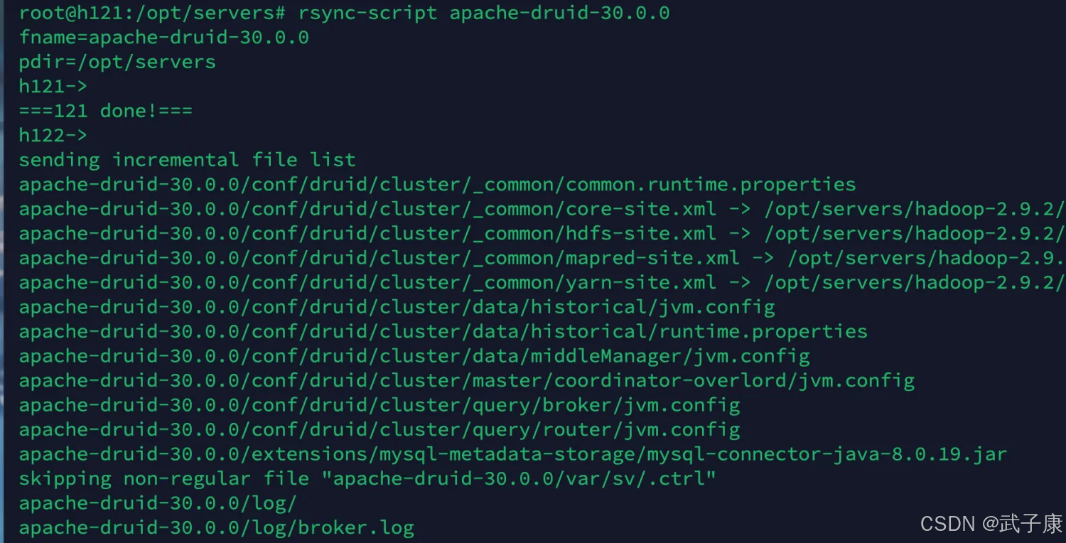 你可以用的方式完成,我这里用之前写好的 rsync-script 工具进行分发,刚才我们配置都是在 h121 节点上完成的,所以接下来,我们从 h121 节点分发到 h122、h123