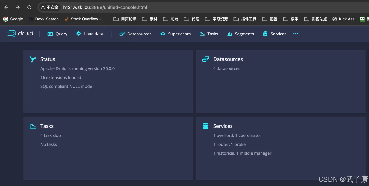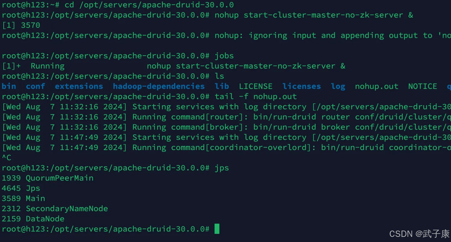 场景:三节点(h121/h122/h123)在已有 ZK/HDFS 上部署 Druid 30.0.0,并将 Broker/Historical/Router 压到低内存可运行。