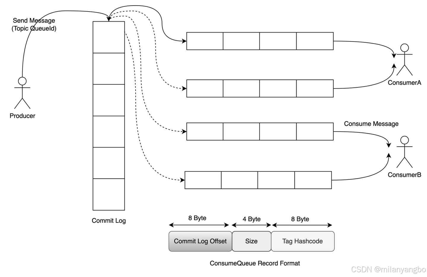 在 RocketMQ 中,所有主题的所有消息数据,无论其逻辑归属如何,都会被首先写入到一个名为提交日志(CommitLog)的中心化大文件中。这个 CommitLog 文件由多个固定大小(默认为 1GB)的文件顺序组成,当前只有一个文件处于可写状态。因为所有写操作都集中在这一点,即便随着主题和队列数量的急剧增加,硬盘在同一时间也只对一个文件进行追加写入,从而保证了绝对的顺序写。为了进一步提升 I/O 效率,RocketMQ 采用内存映射(mmap)技术来读写 CommitLog。当消息需要被消费时,直接扫描庞大的 CommitLog 显然是低效的。为此,RocketMQ 为每个主题的每个消息队列(ConsumeQueue)建立了一个独立的、轻量级的消费队列文件。每个 ConsumeQueue 条目都是固定长度的(20 字节),其中存储了该消息在 CommitLog 中的物理偏移量(Offset)(8 字节)、消息总大小(Size)(4 字节)以及消息 Tag 的哈希码(8 字节)。当消费者拉取消息时,它首先顺序读取对应 ConsumeQueue 文件中的索引条目,根据获取到的物理偏移量,再到 CommitLog 中定位并读取到完整的消息数据。这种“先读索引,再读数据”分离的模式,既保证了写入的绝对顺序性,又实现了消费时的高效查找。此外,为了支持按消息 Key 或时间范围等维度的快速查询,RocketMQ 还提供了可选的索引文件(IndexFile)。其底层数据结构本质上是一个存储在硬盘上的哈希表。IndexFile 由文件头、哈希槽(Slot Table)和索引条目列表(Index Linked List)三部分组成。当根据 Key 查找时,先计算 Key 的哈希值并定位到对应的哈希槽,该槽内存储了指向最新一条索引条目的指针。由于可能存在哈希冲突,具有相同哈希值的索引条目会通过前向指针形成一个链表。