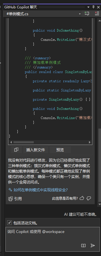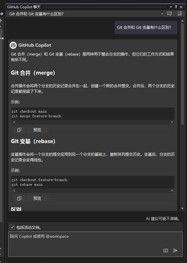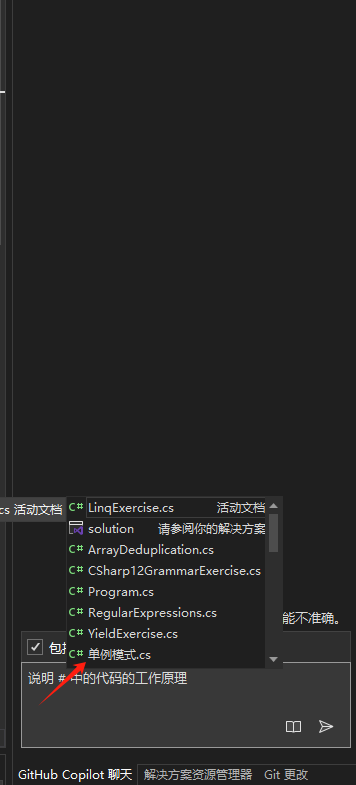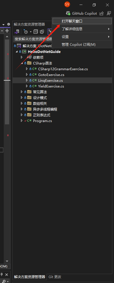 Visual Studio 中使用 Copilot 聊天窗口提问