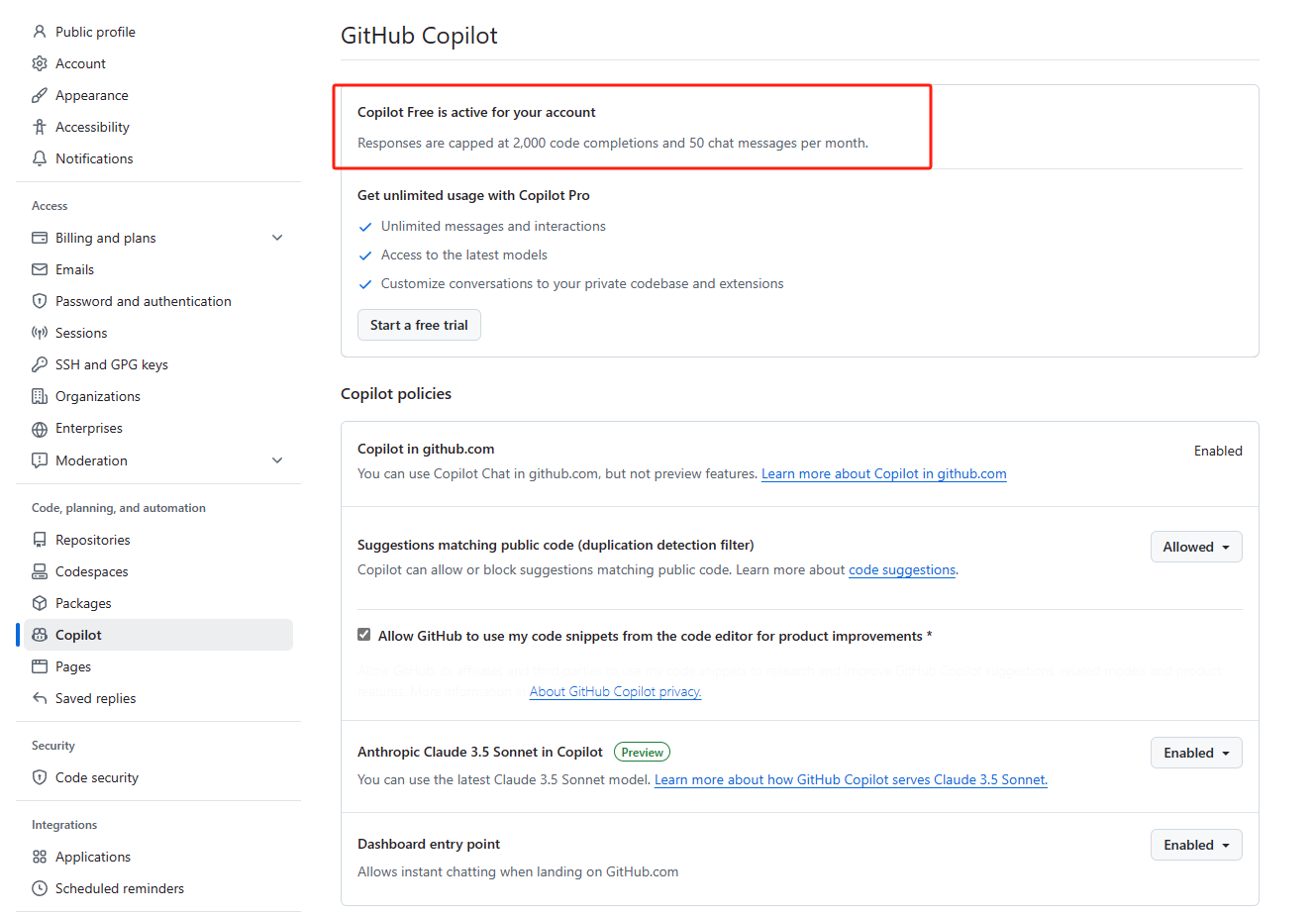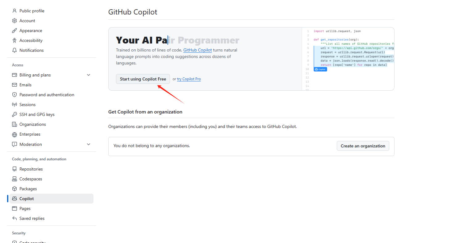 注册或者登录 GitHub 账号 => Settings => Copilot => 点击 Start using Copilot Free。