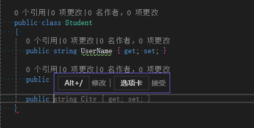 下面演示的是 Visual Studio 中 GitHub Copilot 的代码生成功能。如果选择使用代码,则可以选择 Tab 以将其插入代码文件中: