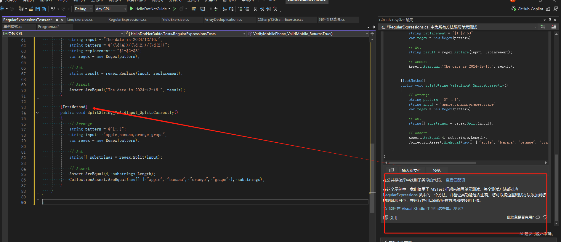 Visual Studio 中使用 Copilot 编写单元测试