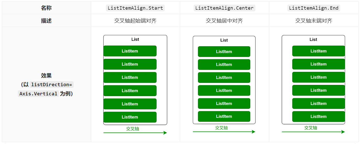 方法可以设置子组件在交叉轴方向的对齐方式,其参数类型为枚举类型ListItemAlign