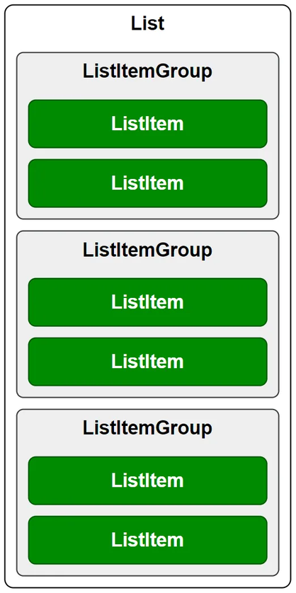 List 容器的子组件为 ListItem 或者 ListItemGroup,其中,ListItem 表示单个列表项,ListItemGroup 用于列表数据的分组展示,其子组件也是 ListItem,具体用法如下