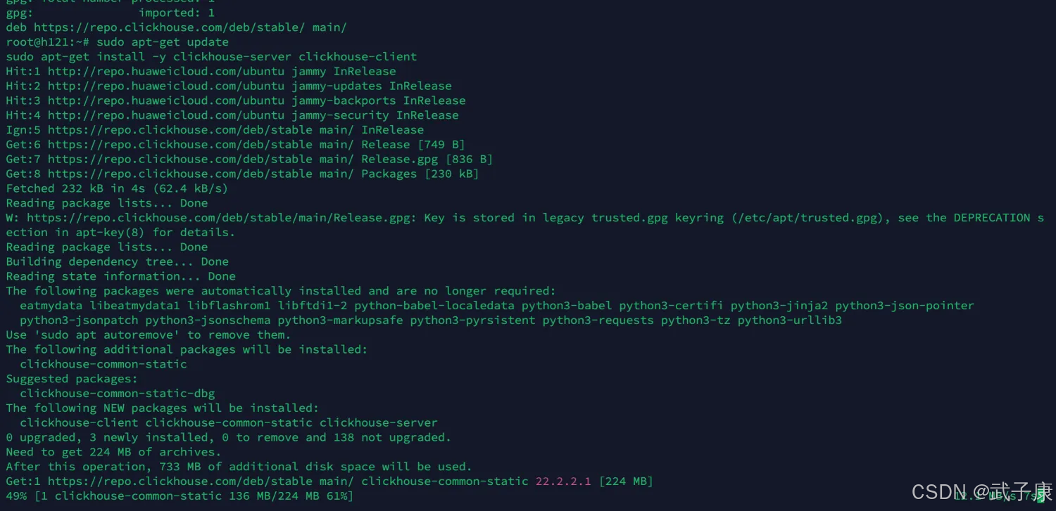 # 1) 依赖 & keyringsudo apt-get install -y apt-transport-https ca-certificates curl gnupgcurl -fsSL 'https://packages.clickhouse.com/rpm/lts/repodata/repomd.xml.key' \ | sudo gpg --dearmor -o /usr/share/keyrings/clickhouse-keyring.gpg