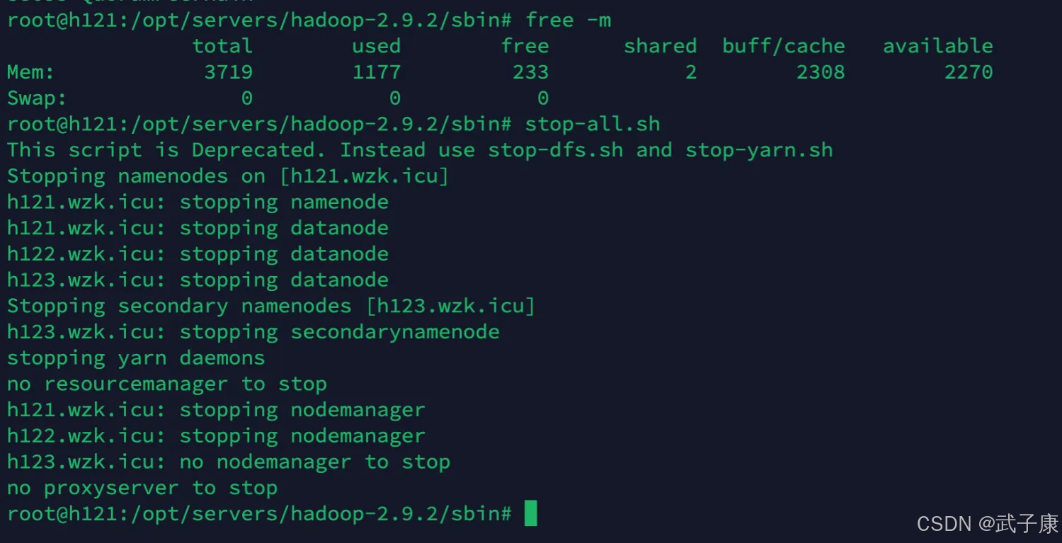 我们需要停止之前的服务,来空出一定的内存和端口给 ClickHouse 使用。(如果你的内存比较富裕可以忽略)只保留 ZooKeeper 即可,其他服务可以都关闭掉。比如 Hadoop 集群、Kafka 集群、Redis 集群等。