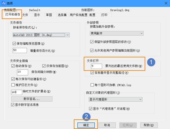 我们可以点击菜单【工具-选项】(【OPTIONS】命令),选择【打开和保存】选项,然后在【文件打开】,在【要列出的最近使用文件数(N)】设置需要数量即可。