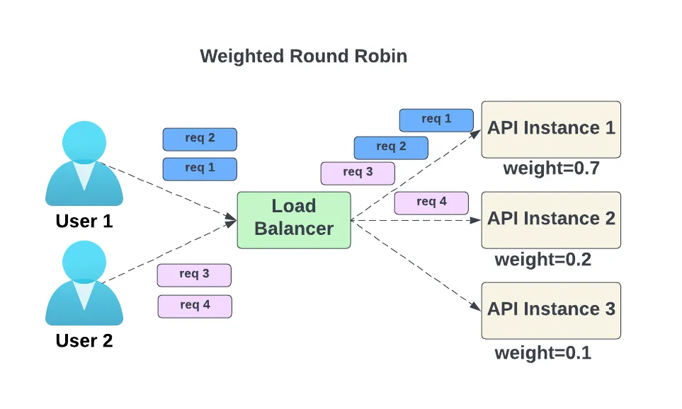 - 加权轮询 —— 管理员可以为每个服务分配权重,确定每个服务处理请求的比例。