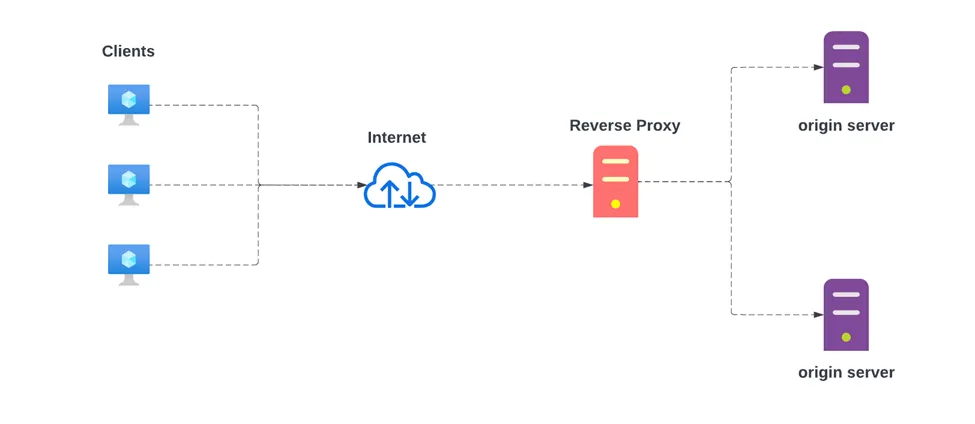反向代理充当客户端和服务器之间的中介。客户端仅与反向代理进行交互以访问后端服务器,因为代理会将请求转发到相关的服务器。这种机制将各个服务器的具体实现细节隐藏在内部网络中。如下所示,反向代理位于源服务器之前,确保客户端永远不会直接与该源服务器进行通信。