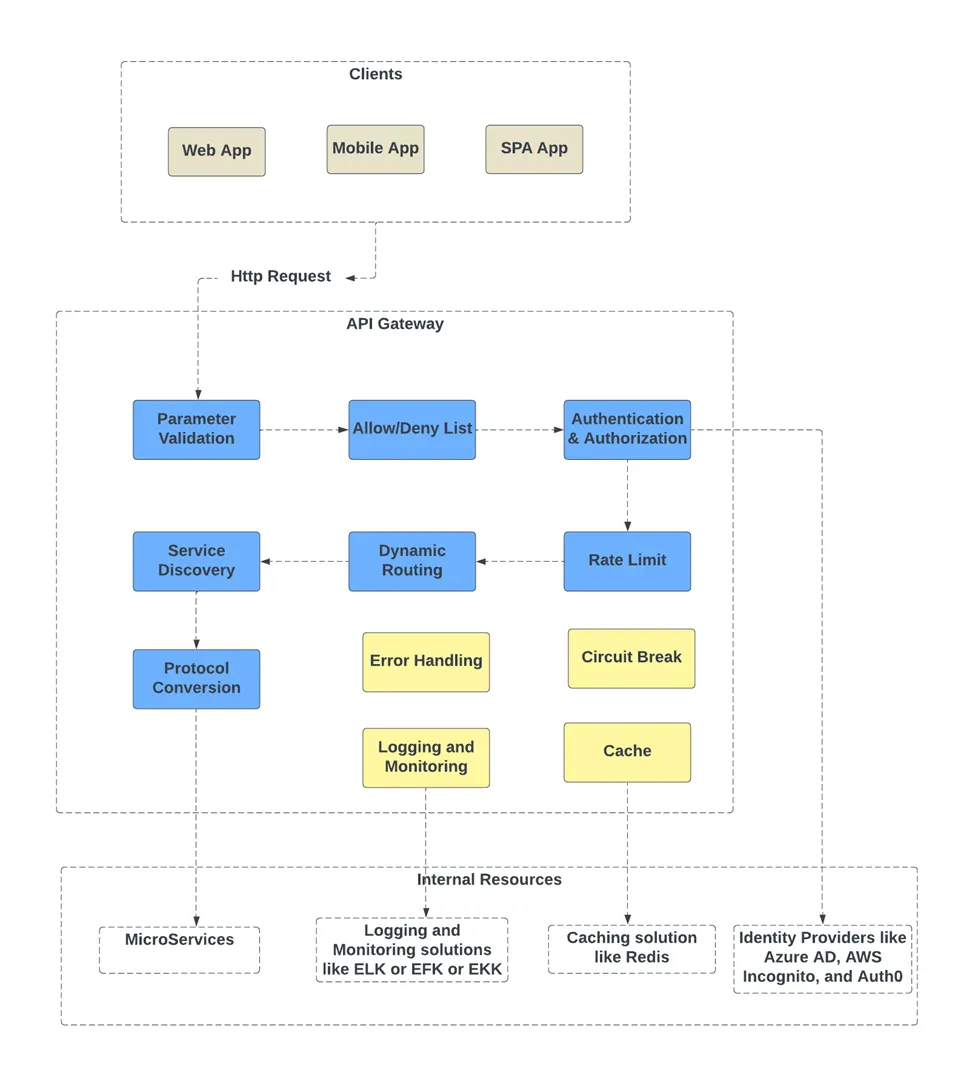 下图中,蓝色方块是 HTTP 请求所经过的步骤。黄色方块是 API 网关在处理 HTTP 请求时提供的其他功能。