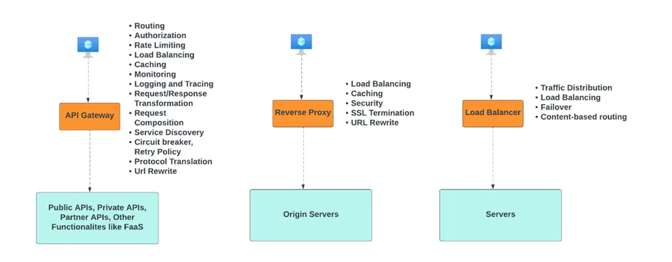 上述例子为我们提供了足够的背景信息,能够帮助我们理解三种技术之间的差异。简单来说,反向代理和 API 网关都具备负载均衡功能以及其他功能。此外,API 网关是一种专门用于管理 API 的反向代理类型。我们将深入探讨它们各自的特点。