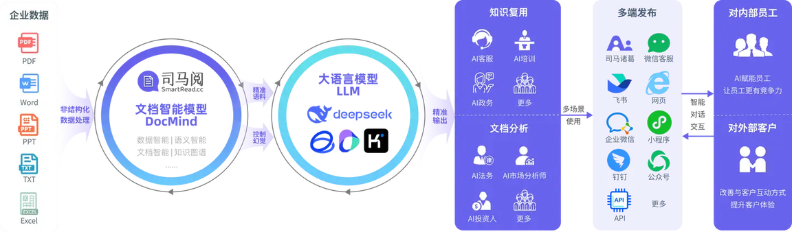 基于自研文档智能模型 DocMind(已获国家模型备案),司马阅开发了国产领先的 AI 文档智能体平台,助力企业严肃场景 AI 落地,将企业大量非结构化文档数据转化为"大模型可理解"的标准化数据,有效控制大模型幻觉,AI 回答更精准、更落地。目前该平台已落地服务上百家企业客户,已服务了招投标、广告营销、工程监理、电信通讯、生产制造、物流供应链、食品、宠物医疗、法律等行业。
