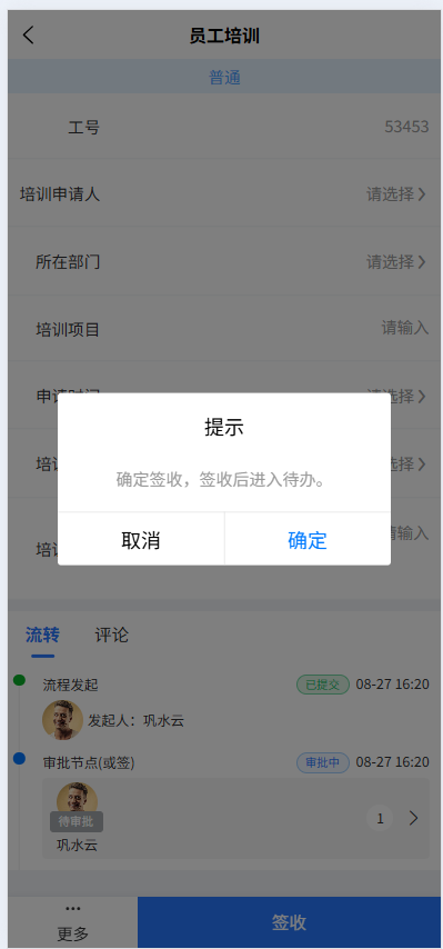 找到要处理的流程,点击右侧 “签收” 按钮,会跳转到流程详情页 —— 这里能看到表单信息(比如工号、培训项目)、流转记录(发起人是谁、什么时候提交的)、流程图(当前到哪个节点),还能在 “评论” 区加备注(比如 “晚点处理,先签收”);