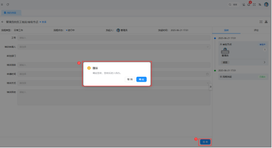 确认没问题后,点击详情页右下角 “确定”,系统会弹出 “签收后进入待办” 的提示,再点一次 “确定” 就完成了 —— 之后这条流程会从 “我的待签” 消失,出现在 “我的待办” 里。