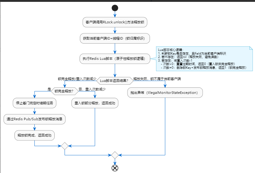 释放锁同样通过 Lua 脚本保证 “判断锁标识 + 删除锁 / 减少重入次数” 的原子性
