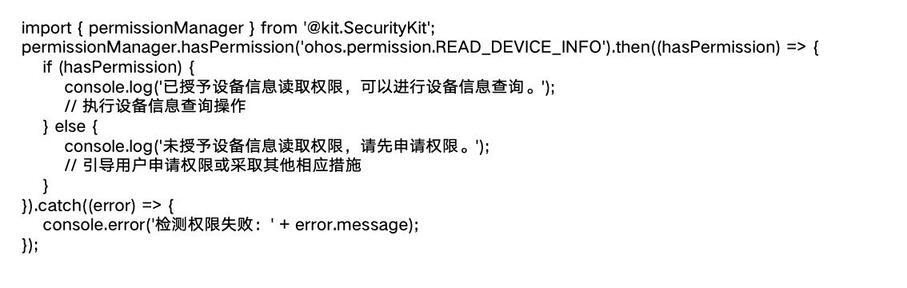 2. 检测特定权限是否已授予:在执行某些关键操作之前,需要检测特定权限是否已经授予。比如,在进行设备信息查询之前,先检查是否具有设备信息读取权限: