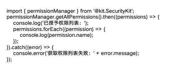 1. 获取已授予权限列表:应用可以通过相应的接口获取当前已授予的权限列表,以便在运行时根据权限情况调整功能或提供相应的提示。例如,以下代码可以获取当前应用的所有权限: