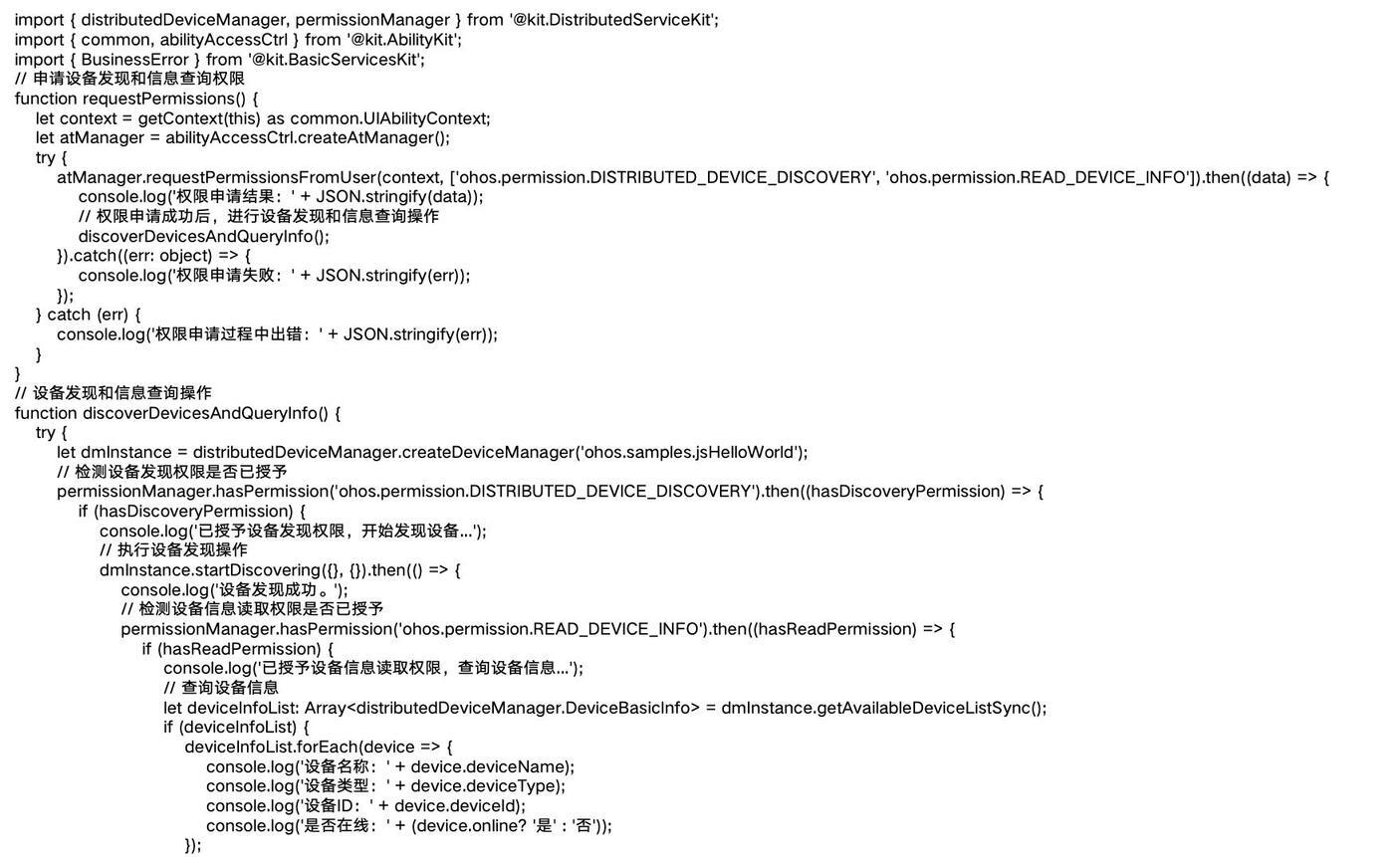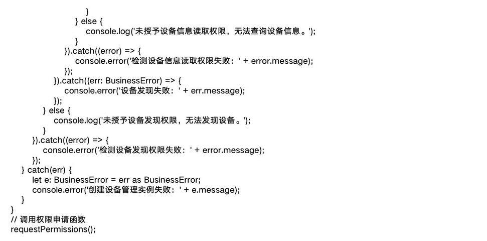 在这个示例中,首先定义了 requestPermissions 函数用于申请设备发现和信息查询权限,成功后调用 discoverDevicesAndQueryInfo 函数进行设备发现和信息查询操作。在 discoverDevicesAndQueryInfo 函数中,分别检测了设备发现权限和设备信息读取权限,根据权限情况执行相应的操作,并处理可能出现的错误。