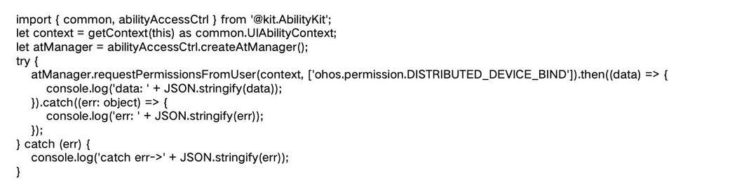 3. 动态申请权限(如有需要):对于一些敏感权限,除了在配置文件中声明外,还需要在应用运行时动态向用户申请。这是为了让用户充分了解应用将如何使用这些权限,并给予用户自主选择的权利。例如,当应用首次尝试进行设备绑定操作时,可以使用如下代码动态申请权限: