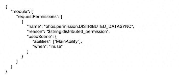 2. 在配置文件中声明权限:将所需权限在应用的配置文件(如 module.json5)中进行声明。以申请分布式数据同步权限(ohos.permission.DISTRIBUTED_DATASYNC)为例,配置如下: