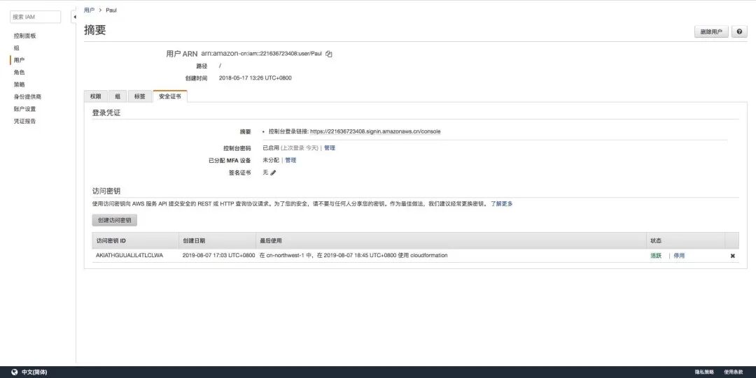 打开 Amazon 控制台,选择 IAM 服务,选择一个有足够权限的 IAM 用户(如 Administrator 权限),创建新的访问密钥,并记录创建的访问密钥的 ID 与私有访问密钥(Access Key 与 Secret Key),用于配置实例的访问权限。