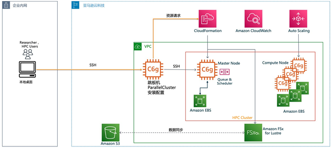 此外,Amazon ParallelCluster 支持各种批处理计划程序,如 Amazon Batch、SGE、Torque 和 Slurm,本文将使用 Slurm 作为批处理程序,ParallelCluster 还支持自动化集成 Amazon FSx for Lustre 并行文件系统和 DCV 远程桌面。以下是 ParallelCluster 架构图: