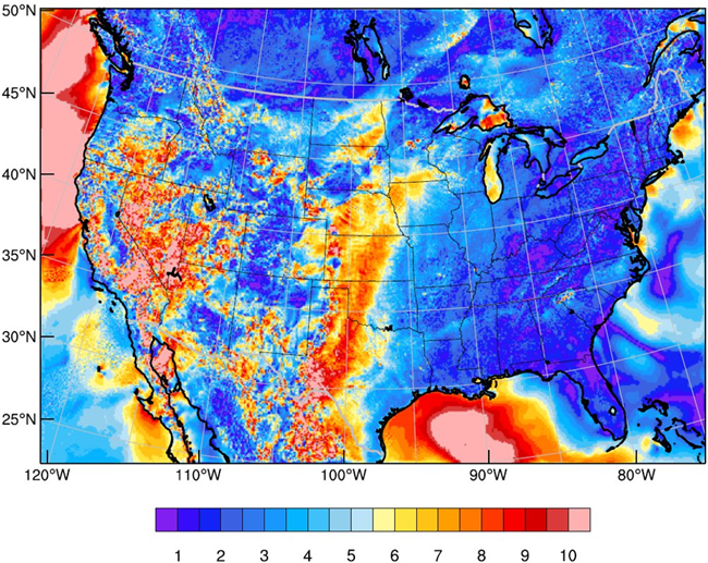 采用 ncview 或者 Panoply 等软件查看结果文件的输出变量和可视化化展示,以下是模拟三小时后的 10m 风速的图形: