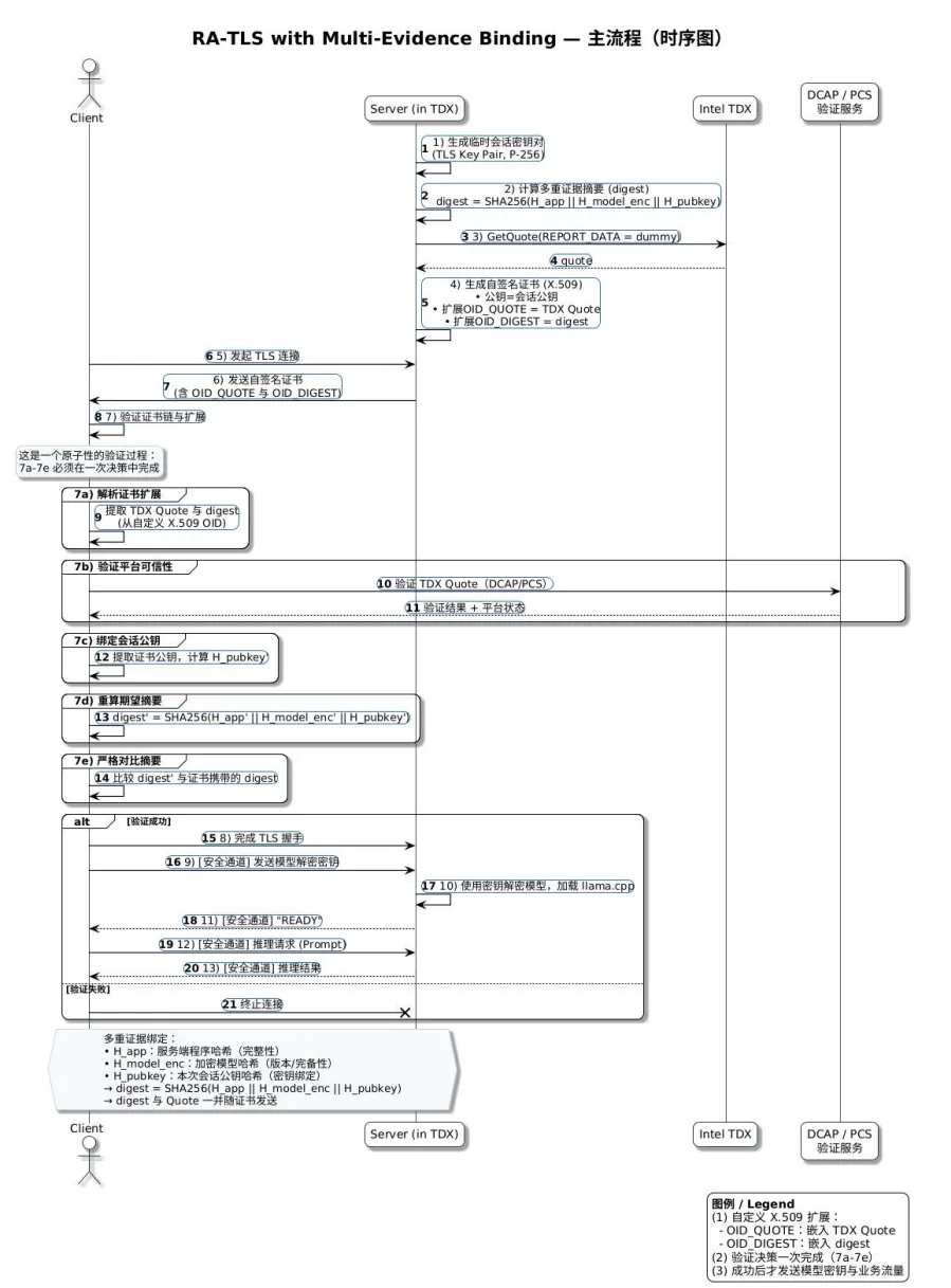 其一,可信执行环境(TEE/TDX)中完成端到端远程证明与密钥交换;